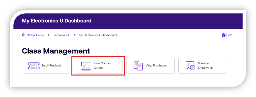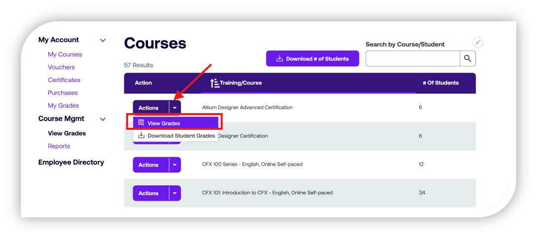 - Next to the course name for the grades you want to access, select the Actions button and View Grades.