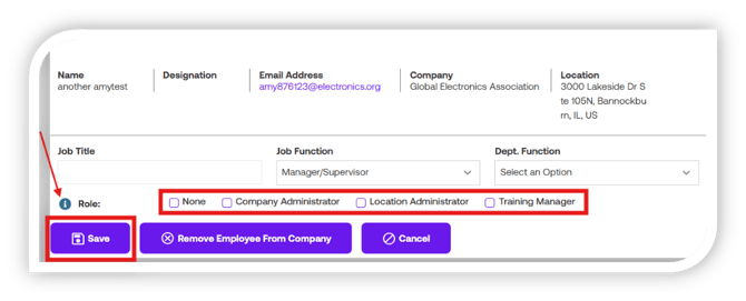 Please note: The user must already be in the Employee Directory; if they are not, please add them now. - You can edit only the user’s job title, function, and administrative roles in their profile. If an individual needs a name or email change, they must contact us directly. To add them as a Location Administrator, check the box labeled “Location Administrator.” Then, click Save.