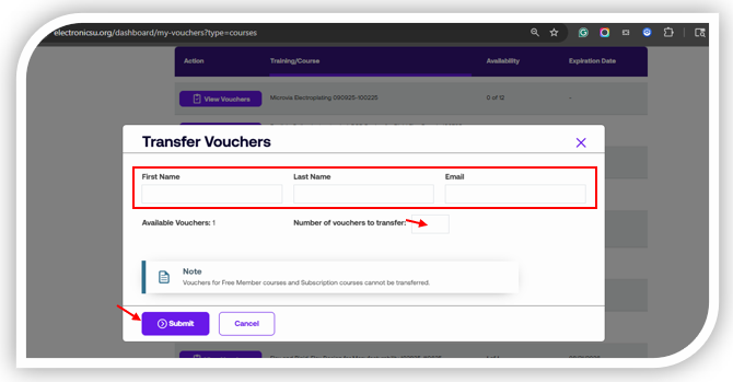 Note: You can only transfer vouchers that have been purchased; you cannot transfer any free member or subscription course vouchers. -