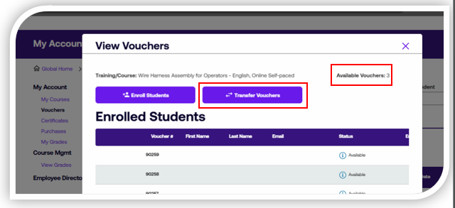 Click View Vouchers next to the course title that contains the voucher you wish to transfer.