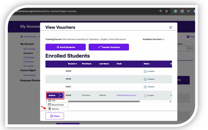Select View Vouchers next to the course title you will be un-enrolling the student from