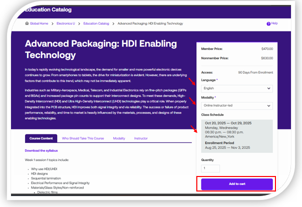 - You are now on the Course Details Page, which contains course details such as Course Content, Pricing, Language, Modality (Self-Paced or Online Instructor-Led), and Class Schedules (Online Instructor-Led).