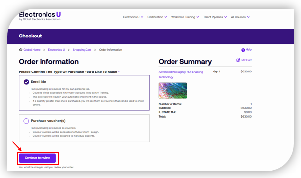 - You will be directed to Go to Cart or Continue Shopping. If no other courses are purchased, select Go to Cart. Then, start the checkout process and verify that your items have been added.
