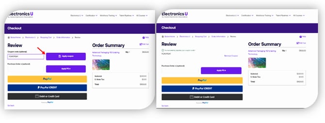 - Coupon Code – Promotion code is entered for any current Global Electronics Association promotions on Workforce Training Courses. Select Apply Coupon after entering a valid promotion code to see the discount applied to your item.