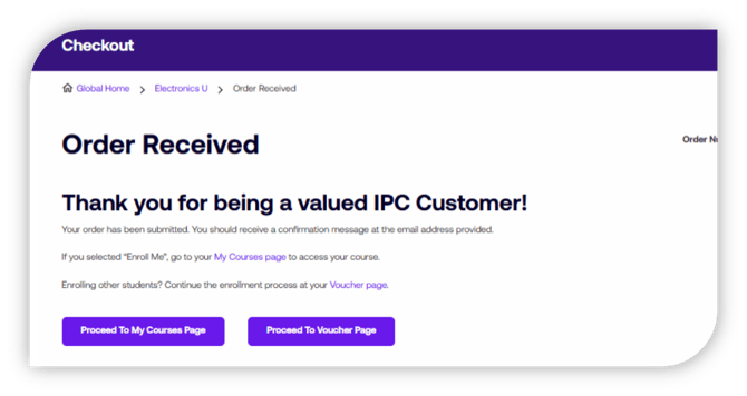 - After entering your payment details and selecting the Pay button, you will be directed to the Order Received confirmation page. You can proceed to the Voucher page to complete the enrollment process, or if you selected the “Enroll Me” option during checkout, you can select “Proceed to my courses page” to locate the course start button.
